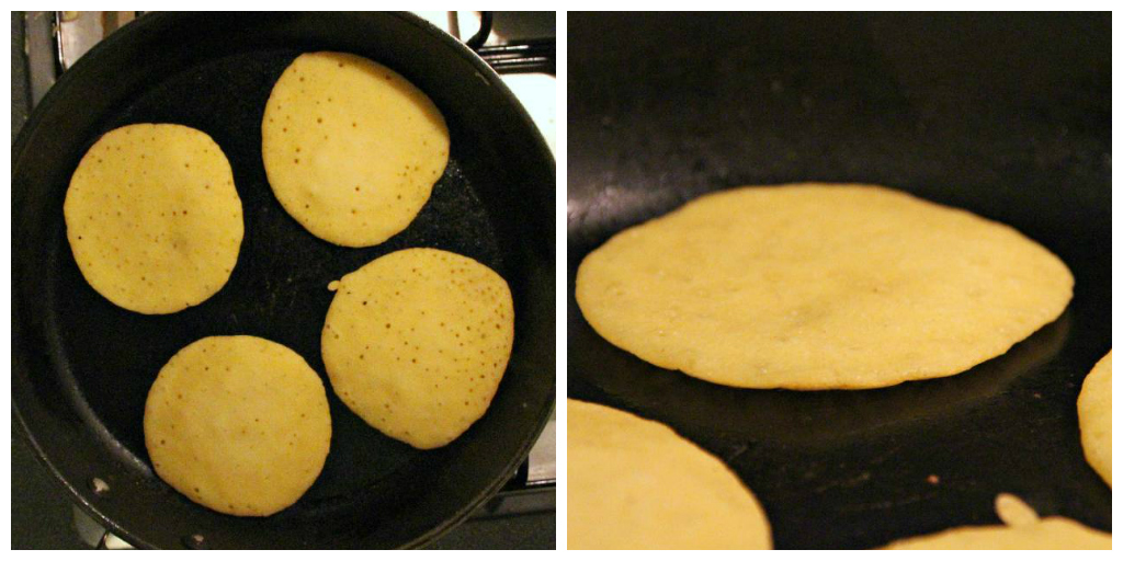 3. Take about 2 tablespoons of the batter to create one corn pone, swirl the batter with the spoon to spread it evenly out on the pan to create a little pancake. Bake them on medium heat. In a 27 cm pan you can make 4 smaller pone cones at the time.