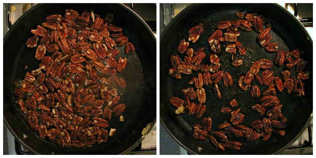6. In the same pan put in the pecans. Toast lightly for 2-3 minutes. Pour in 2 tablespoons maple syrup. Turn the heat off and let caramelize. Take all of them off the pan when finished, or else they will stick to the pan.