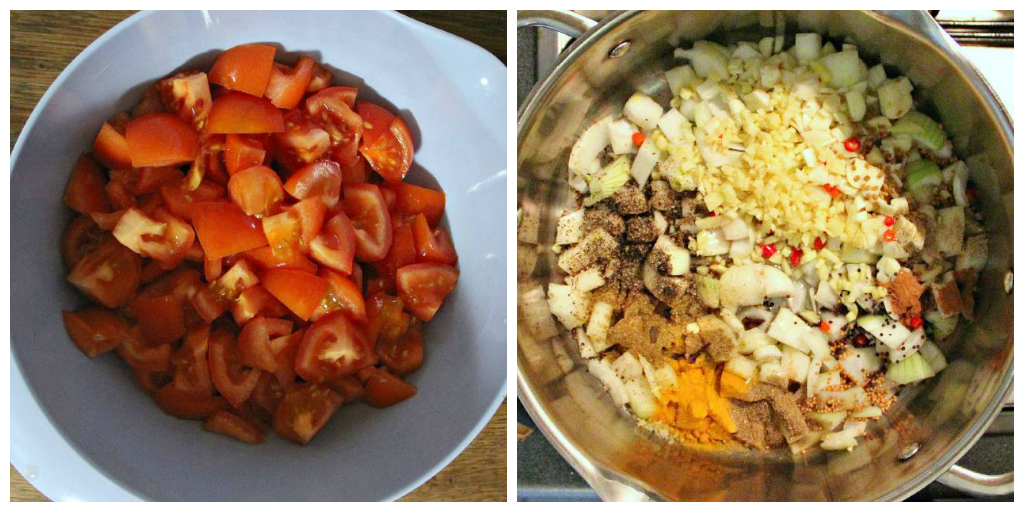 - Peel and roughly chop the onions and garlic. Finely chop the ginger and chili. Add to the big pot with the oil and the salt, pepper, cloves, turmeric, coriander, cumin, fenugreek, yellow and black mustard seeds, cardamom and cinnamon. Turn the heat on high and sweat the onions.