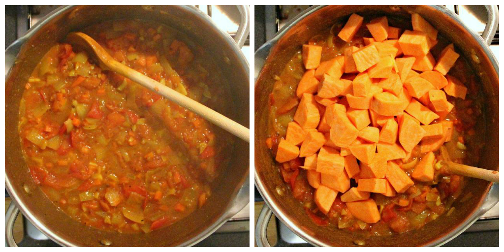 - Peel and chop the sweet potatoes. Then add to the sauce. Put a lid on and let simmer for about 10-20 minutes, or until the sweet potato is tender, this depends on the size you chop them.