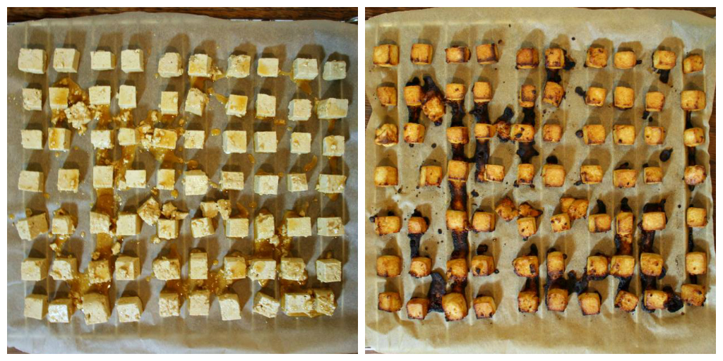 - Drain the tofu well. Cube them and transfer to a mixing bowl and add in the marinade. Mix gently to fully cover the tofu in the marinade. Arrange on a baking tray with baking paper. Bake in a preheated oven at 200c (390 F) in the middle of the oven on convection for about 18-20 minutes.