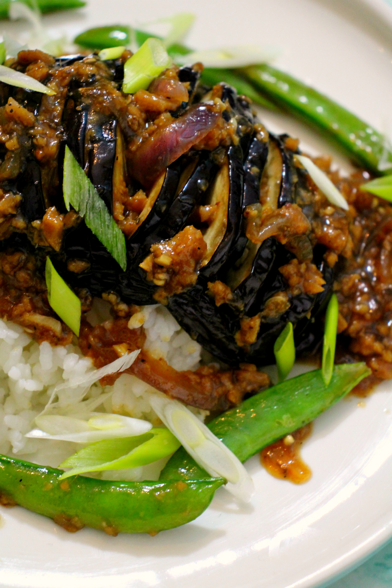 Yeah it kinda looks like alien food.. but also kind of cool looking ! Haha.. Hasselback roasted aubergine (eggplant if you wish), on a bed of sticky rice, loaded with glazed minced seitan and snap peas, garnished with fresh spring onion.