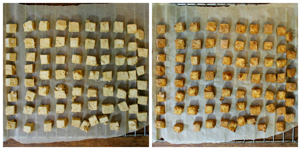- Chop the tofu into cubes, put into a bowl, add in the soy sauce, rice vinegar and sesame oil. Allow to soak for a few minutes. Add in the starch, toss gently to coat. Put on a lined baking tray. Bake in a preheated oven on 200c (390 F) in the middle of the oven on normal setting for about 15-18 minutes or until golden and slightly crisp on the edges.