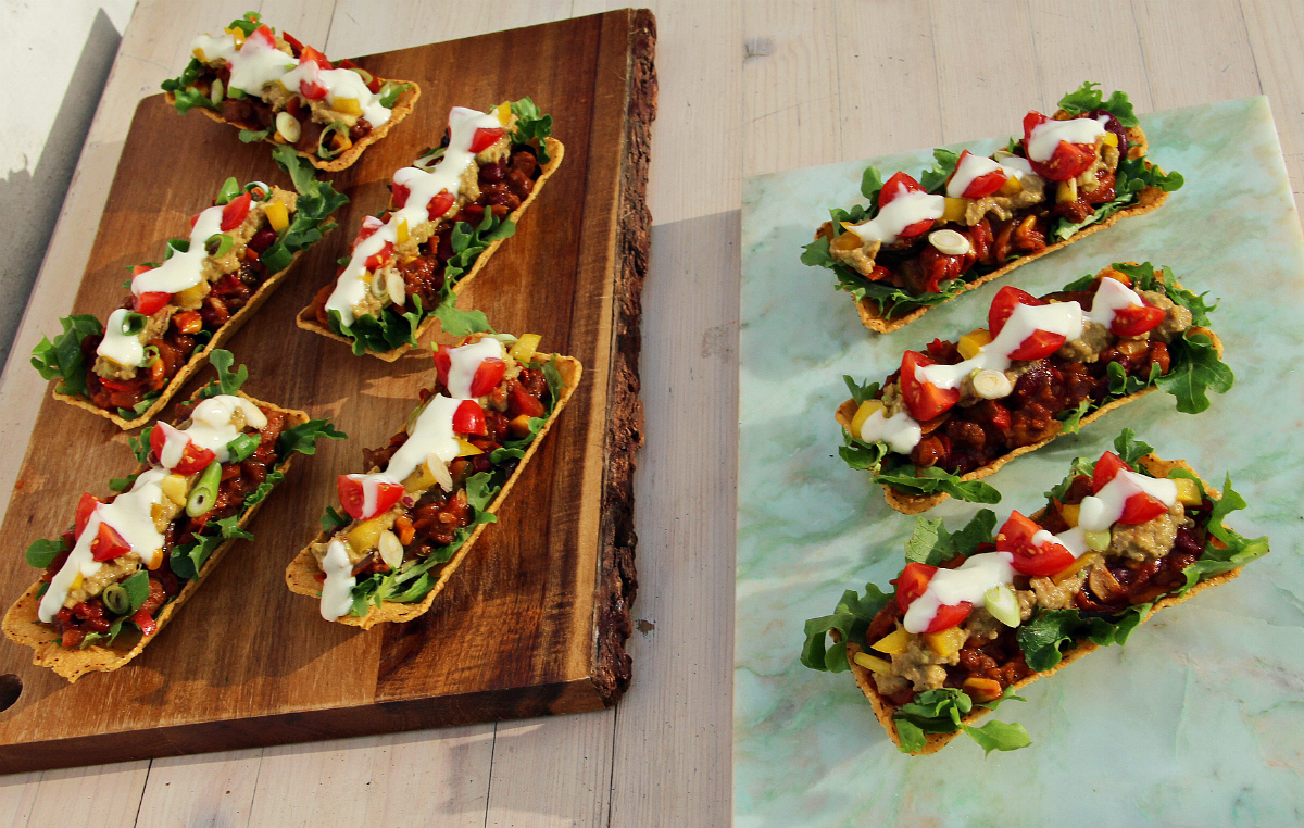 The tacos that I use are hard shell ones, kinda similar to the nacho texture. We use both normal taco shapes and tubes / boats. Personally I prefer the boats, they’re less messy to eat and hold a lot of filling while making a good presentation.