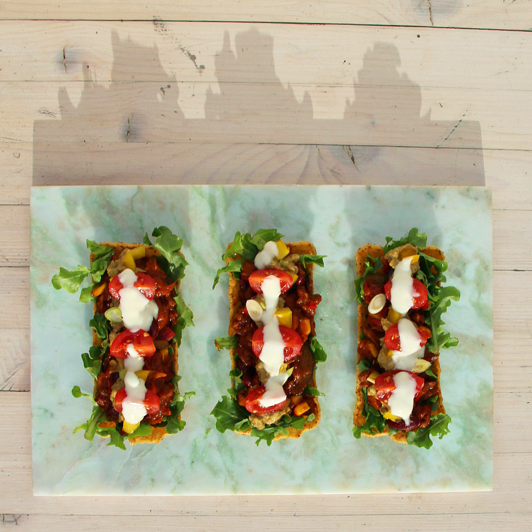 I love a savoury sauce full of soy granules, kidney beans and corn with those warm flavours of cumin and paprika. Topped with Vegan Creamy Guacamole, vegan creme fraiche. A crunchy salad, ripe tomatoes and sweet yellow bell pepper adds a cool crunch and freshness to the hot sauce.